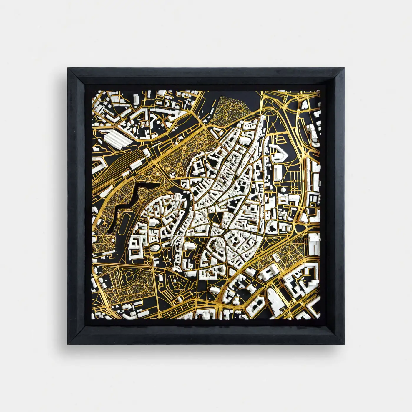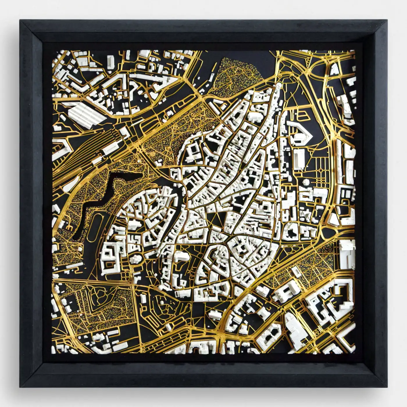 - Zelta – Melna matēta pamatne, silti pelēkas ēkas, zelta ceļi.